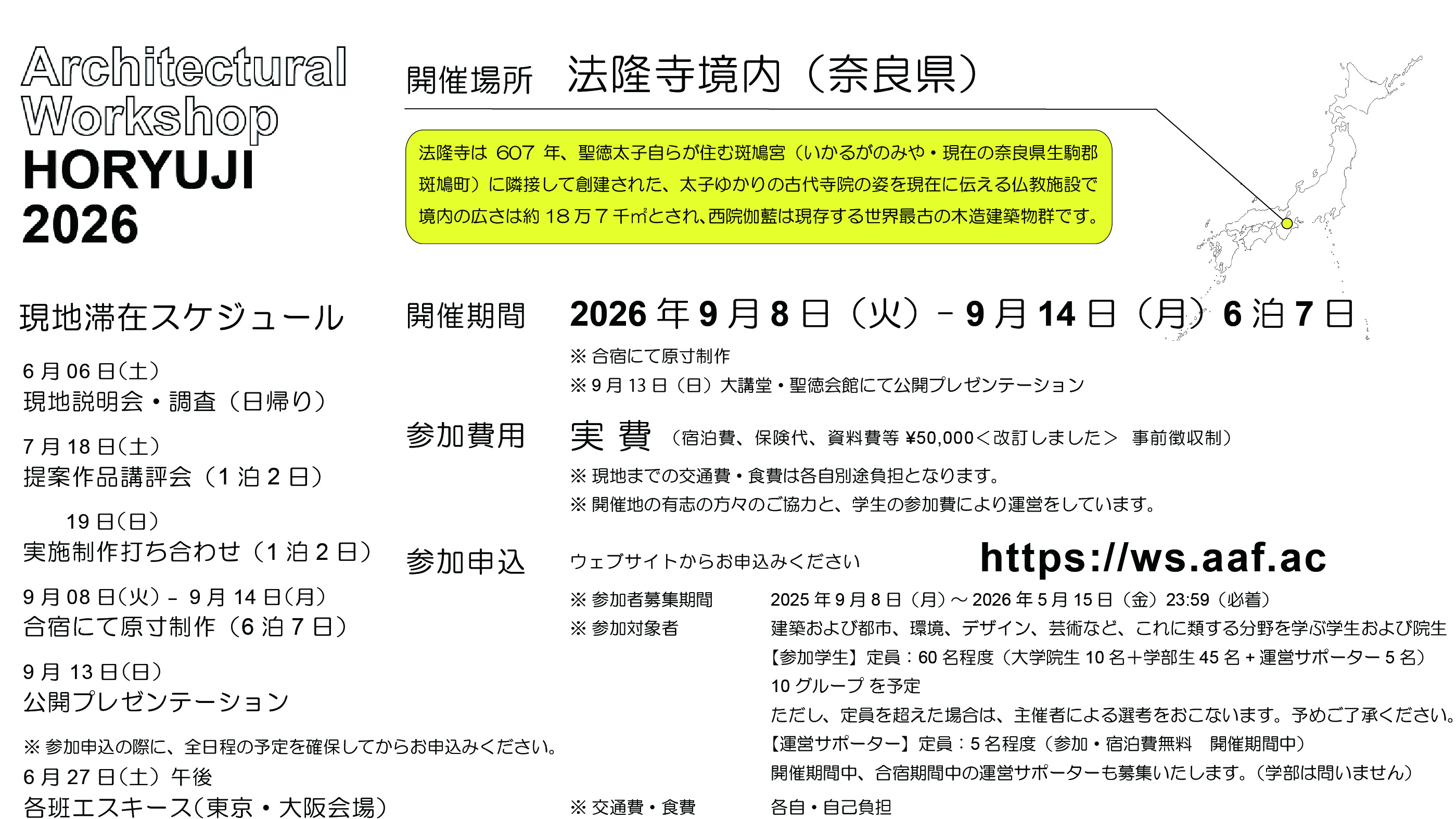 ――― 全国の大学生が参加するこの建築学生ワークショップは、毎年、場所を移しながら開催してきました。歴史と場所の特性をはっきりと持つ開催地と、周辺の生活文化を合わせて調査することにより、観光として訪れるだけでは知ることのできない、街や地域との関わりや、建築を保全していく造り方の技にも触れ、制作を含めた実学としての地域滞在を叶えます。神聖な場所の静粛な空間からコンテクストを見出し、現場で建築の解き方を探るきっかけを経験していきます。この法隆寺は607年、聖徳太子自らが住まわれた斑鳩宮に隣接したこの地に創建された、太子ゆかりの古代寺院です。金堂、五重塔を中心とする西院伽藍と、夢殿を中心とする東院伽藍に分けられ、境内の広さは約18万7千㎡。西院伽藍は現存する世界最古の木造建築物群で1993年に「法隆寺地域の仏教建造物」として、ユネスコの「世界遺産」に登録され、新たな歴史を刻み当時と同じ姿を現代に伝えています。近現代における主要都市のまちづくりに欠かせない最も貴重となる「聖地」という清らかな場に身を置き、全国から集まる建築学生らが伝統的な構法に触れ、この場に位置づけた建築の解釈を生み出します。このワークショップでは場所の特性を用いるため、大きく分けて「歴史」「場所性(地形)」「現代の問題」の観点を提案に求めます。法隆寺で受け継がれてきた、空間性へのテーマや実現へのコンセプトのヒントとなる話題を、どうか併せてお聞かせください。 本日は開催地として多大なご尽力をくださいます法隆寺にて、全国の参加学生に向けてお導きをくださる、古谷管長をはじめ、大野執事長にもご参加をいただき、この建築ワークショップを初年度から見守り続けてくださる、東京大学の腰原先生、佐藤先生、そして毎年、私たちと併走したサポートをくださいます旭ビルウォールの櫻井社長、オーガナイザーの役割を担い続けてくださいます、建築家の平沼先生と共に、法隆寺開催についてお聞きしたいと思います。皆さま本日はどうぞよろしくお願いいたします。