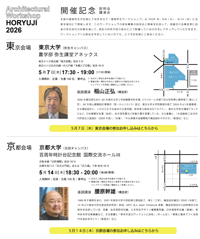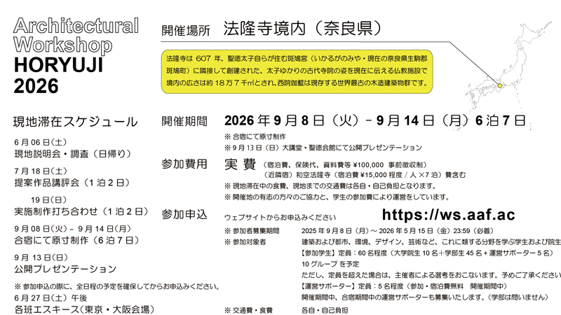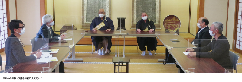 ――― 全国の大学生が参加するこの建築学生ワークショップは、毎年、場所を移しながら開催してきました。歴史と場所の特性をはっきりと持つ開催地と、周辺の生活文化を合わせて調査することにより、観光として訪れるだけでは知ることのできない、街や地域との関わりや、建築を保全していく造り方の技にも触れ、制作を含めた実学としての地域滞在を叶えます。神聖な場所の静粛な空間からコンテクストを見出し、現場で建築の解き方を探るきっかけを経験していきます。この法隆寺は607年、聖徳太子自らが住まわれた斑鳩宮に隣接したこの地に創建された、太子ゆかりの古代寺院です。金堂、五重塔を中心とする西院伽藍と、夢殿を中心とする東院伽藍に分けられ、境内の広さは約18万7千㎡。西院伽藍は現存する世界最古の木造建築物群で1993年に「法隆寺地域の仏教建造物」として、ユネスコの「世界遺産」に登録され、新たな歴史を刻み当時と同じ姿を現代に伝えています。近現代における主要都市のまちづくりに欠かせない最も貴重となる「聖地」という清らかな場に身を置き、全国から集まる建築学生らが伝統的な構法に触れ、この場に位置づけた建築の解釈を生み出します。このワークショップでは場所の特性を用いるため、大きく分けて「歴史」「場所性(地形)」「現代の問題」の観点を提案に求めます。法隆寺で受け継がれてきた、空間性へのテーマや実現へのコンセプトのヒントとなる話題を、どうか併せてお聞かせください。 本日は開催地として多大なご尽力をくださいます法隆寺にて、全国の参加学生に向けてお導きをくださる、古谷管長をはじめ、大野執事長にもご参加をいただき、この建築ワークショップを初年度から見守り続けてくださる、東京大学の腰原先生、佐藤先生、そして毎年、私たちと併走したサポートをくださいます旭ビルウォールの櫻井社長、オーガナイザーの役割を担い続けてくださいます、建築家の平沼先生と共に、法隆寺開催についてお聞きしたいと思います。皆さま本日はどうぞよろしくお願いいたします。