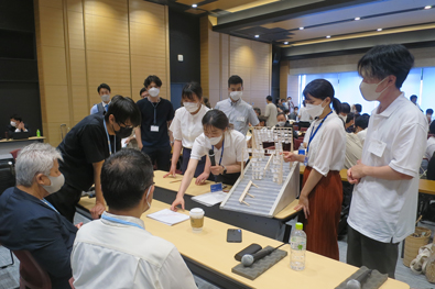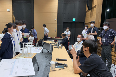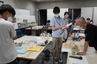 2日目には、各班の設計趣旨と、前日の講評結果を受け日本を代表する組織設計事務所、施工会社により技術指導をいただくため、多くの技術者をアドバイザーに迎え、各班の制作準備となる素材決定や加工方法、実制作の準備や発注、試作から完成に向けた具体的な施工方法の検討会を実施しました。今年は講評者の皆様も駆けつけてくださり、前日から再度練り直した案をクリティークしていただき、活発に議論を交わすことができました。 |