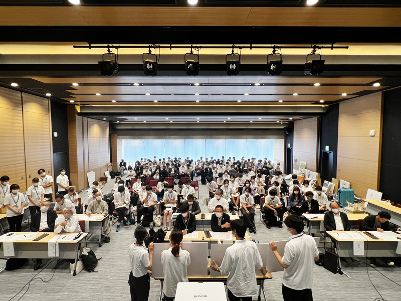 | 1 日目には、各班より提案作品の発表を行い、技術者合宿指導の中心を担われる施工者代表者、そして、日本を代表される多くのプロフェッサー・アーキテクトや、ストラクチャー・エンジニアによる講評会を実施しました。 嚴島神社の野坂宮司様、大聖院の吉田座主様もご参加くださいました。 | |||