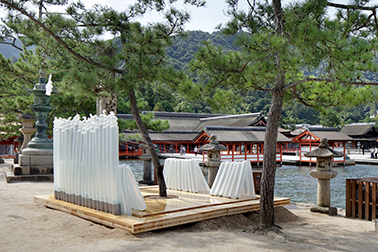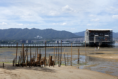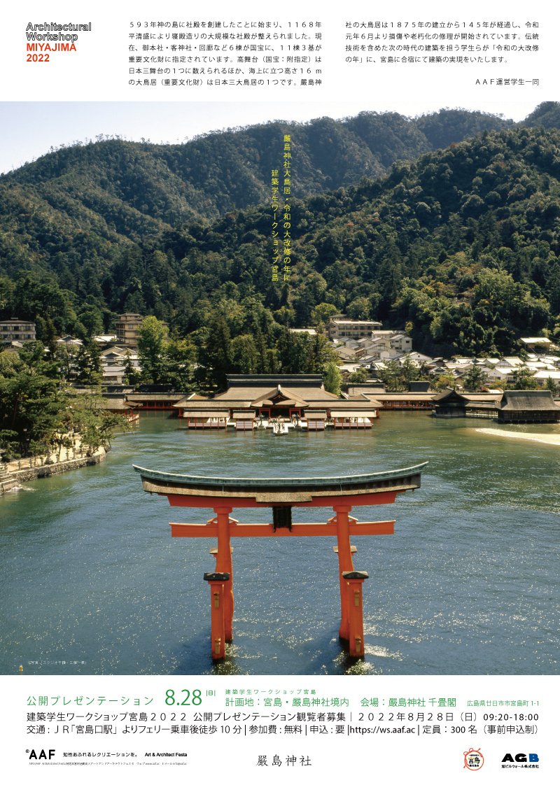 ――― 全国の大学生が参加するこの建築学生ワークショップは、毎年、場所を移しながら開催してきました。歴史と場所の特性をはっきりと持つ開催地と、周辺の生活文化を合わせて調査することにより、街や地域との関わりや建築を保全していく造り方の技に触れ、制作を含めた実学として地域滞在を行い、神聖な場所の静粛な空間からコンテクストを見出し、現場で建築の解き方を探るきっかけを経験していきます。現在、嚴島神社の大鳥居は1875年の建立から145年が経過し、令和元年6月より損傷や老朽化の修理が開始されています。社殿は現在、御本社・客神社・回廊など6棟が国宝に、11棟3基が重要文化財に指定されています。平舞台(国宝:附指定)は日本三舞台の1つに数えられるほか、海上に立つ高さ16mの大鳥居(重要文化財)は日本三大鳥居の1つとなります。近現代における主要都市のまちづくりに欠かせない最も貴重となる「聖地」という歴史環境を現代にも残す清らかな場に身を置き、全国から集まる建築学生らがこの伝統的な構法に触れ、この場に位置づけた建築の解釈を生み出します。このワークショップでは場所の特性を用いるため、大きく分けて「歴史」「場所性(地形)」「近代の問題」の観点を提案に求めます。現代に受け継がれてきた嚴島神社で、空間性へのテーマや実現へのコンセプトのヒントとなる話題を、どうか併せてお聞かせください。 本日は開催地として多大なご尽力をくださいます嚴島神社にて、全国の参加学生に向けてお導きをくださる野坂宮司をはじめ、これまでこの開催実現へとご協力をくださっている宮島の皆さまにもご参加をいただきながら、この建築ワークショップを初年度から見守り続けてくださる、東京大学の腰原先生、佐藤先生、そして毎年、私たちと併走したサポートをくださいます、旭ビルウォールの櫻井社長と、オーガナイザーの役割を担い続けてくださいます、建築家の平沼先生と共に、「大鳥居・令和の大改修」完遂の年に合わせた宮島開催についてお伺いいたします。皆さま本日はどうぞよろしくお願いいたします。 平沼:593年に創建され1168年にこの大規模な社殿が整えられたと伝えられています。現代にまで続く聖地となり今もこれだけの方たちに受け継がれてきた思想と、宮島と周辺に暮らす方たちの生活文化やこの場所が選ばれた背景をお聞かせいただけませんでしょうか。 野坂:伝承によると、海で釣りをしていた土地の者に、御祭神がどこか良い所がないかという問いかけをされたそうです。そして、カラスの先導により島を見ながら廻られたのですが、その時点でこの島はもう選ばれていたと考えられます。この島自体が、神様のような存在なのですね。私がこういうことを言うのは変かもしれませんが、たまたまこの島が選ばれて、今のこの状態があるのだということかもしれません。ですから、仮にもう少し西に阿多田島がありますが、そこを神様が選ばれて神社が造られていたら、この島はただの普通の島だったと思います。 平沼:なるほど。当時の島の住民の生活文化はどのようなものだったのでしょうか?この大規模な社殿が造られた1160年頃にはもう町があったんでしょうか? 佐々木:観光課が1964年から統計を取られています。来島者は当初200万人ぐらいだったのですが、今年が多分過去最低になりそうです。平均しますと240-250万人程度、増加の追い風になったのは大河ドラマ、「新平家物語」の時に、270万人で、「毛利元就」も312万人くらい。それで過去最大の昨年は465万人ですね。1995年の阪神淡路大震災で一旦減少しましたが、次の年の1996年には宮島が世界文化遺産に登録され、翌年の1997年に毛利元就の大河ドラマが放映され一気に増えて、それからずっと順調に推移してきました。 腰原:明治の頃は、伊勢で作っている厳島錦帯橋マップというのがあって、やはり西に行くと厳島というイメージがあったみたいです。 野坂:参詣地として、そういう捉え方はされていましたが、神社にも昔は厳しい時がありまして、私の祖父の頃は運営がものすごく大変だったということをよく聞かされました。特に今のように交通網も発達していない頃の話です。 佐々木:昭和56年か57年くらいに、修学旅行先に宮島と平和公園が選ばれるようになりお越しになる方が増えたように思います。 野坂:はっきり言って、去年はいわゆるオーバーツーリズム状態になりかけていたんだと思います。それは町の方々がご存知だと思います。 中村:公共施設を中心に、オーバーフローでした。トイレに行列ができたり、桟橋で船舶を待つお客様の列が建物の外までつながったこともありました。神社さんも、参拝されるお客様を整理されるのが随分ご苦労されたと思います。江戸時代から徐々に嚴島神社さんへの参拝のお客様が多くなられて、旅館や、飲食・遊興の施設などが徐々に出来てきました。明治に入ってからは船舶の会社が出来て便利になり、またお客さんが増