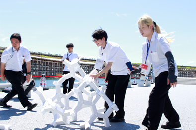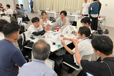 2日目には、各班の設計趣旨と、前日の講評結果を受け日本を代表する組織設計事務所、施工会社により技術指導をいただくため、多くの技術者をアドバイザーに迎え、各班の制作準備となる素材決定や加工方法、実制作の準備や発注、試作から完成に向けた具体的な施工方法の検討会を実施しました。前日から講評者の皆様も残ってくださり、再度練り直した案をクリティークしていただき、活発に議論を交わすことができました。 |