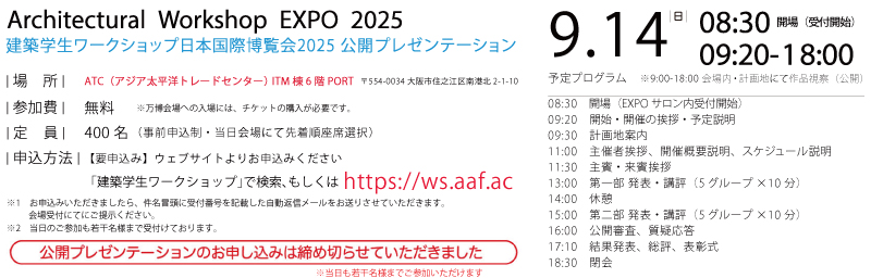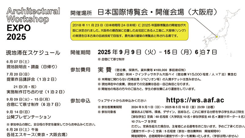 近い将来、我が国の建築会を担う後進に向けて、実務経験豊富な建築技術者の皆様から指導を頂戴できる、貴重な機会を共有する目的。本開催に継続的なご支援をくださる皆様や近畿を中心とする建築技術者の皆様、開催全体のスケジュールと共有し、提案作品講評会(本年:7/20日曜日)と、翌日実施制作打ち合わせ(本年:7/21月曜日)に向けて、本年の開催が始動いたしました。 |