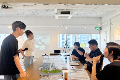 各班の作品のクオリティを高める目的で始まった取り組みとして「各班エスキース」を開催させていただきました。東は東京大学・生産技術研究所にて、腰原先生、櫻井社長、長田先生、安原先生、佐藤先生、吉村先生がご参加くださり、西は平沼孝啓建築研究所にて、陶器先生、片岡先生、平沼先生がご参加くださいました。会場間をzoomで中継し、先生方より、提案作品への貴重なご指導を賜りました。 |